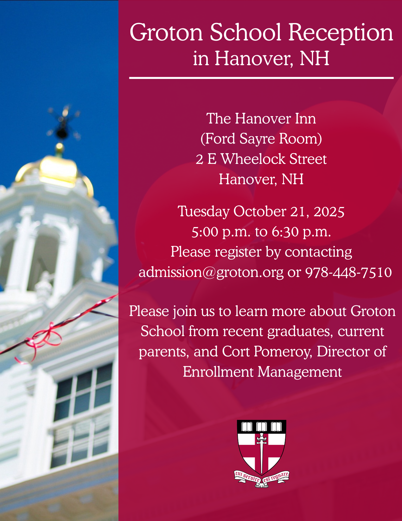 - Groton School Reception at Hanover Inn: Tuesday, October 21
